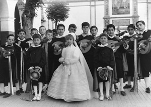 La otra instantánea pertenece a la Rondalla de los Salesianos. Está fechada en 1967 y fue tomada en el patio del Colegio del Carmen. Constituida por jóvenes del Centro, gozó de una extraordinaria simpatía, no sólo en la Comunidad Salesiana, sino también en toda la población, siendo invitada para numerosos actos, amenizando con sus canciones y su alegría muchas jornadas festivas de la ciudad.