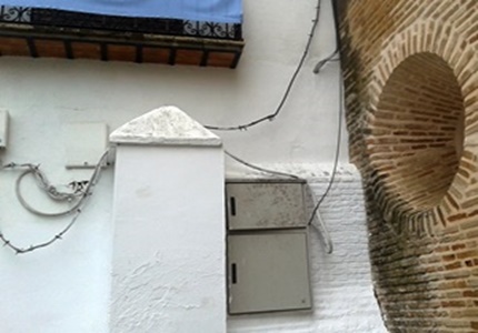 Que la parte baja de esta torre junto con la parte lateral del edificio de la biblioteca municipal se ven cruzadas por diferentes cables eléctricos que incumplen la vigente Ley 14/2007, de 26 de noviembre, de Patrimonio Histórico de Andalucía, en especial su Artículo 19, sobre Contaminación visual o perceptiva, que dice: