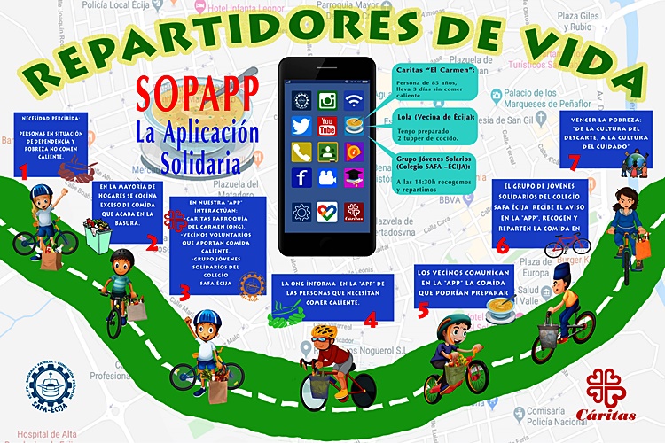 Para dar respuesta a dicha necesidad crearon la aplicación para teléfonos móviles SOPAPP, una aplicación telefónica solidaria en las que interactuarán la ONG Caritas Parroquia del Carmen, vecinos voluntarios de la localidad de Écija dispuestos a donar algo de comida caliente y el grupo de jóvenes solidarios del centro educativo de SAFA Écija.