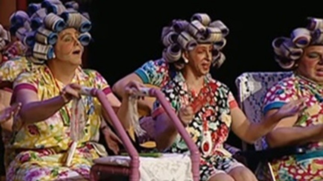 En aquella ocasión tenían colaboración en la música, pero ahora será una labor más 'fraternal'. Van de señoras mayores, con sus rulos y sus andadores; lo de la marcha atrás del carrito genial. Muchos puntos en la presentación. El perro aplastado que la mari se ha sentado encima, las bragas del intimisimi que les quedan ajustadisimi. Mucho arte en la presentación de esta chirigota de Écija